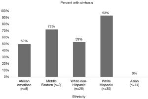 A total of 83 patients were included in the study. Male 42%, female 58%, and 82% of patients had liver cirrhosis at the time of the study. The ethnicity/race of the study population is shown in Table 1. African Americans, Middle Eastern, White non-Hispanic had male predominance with 80%, 55%, and 67% respectively. Diabetes was present in less than 35% of patients in the Middle Eastern, White non-Hispanic and African Americans group and in less than 30% of African Americans and Middle Eastern patients with present in 50% of white Latino patients (Figure 1). Diabetes was present in 38% of the study cohort in total. Fourteen percent of patients had a BMI less than 25 and 100% of patients with normal BMI presented with NASH vs. NAFLD. More Hispanics self-reported DM, HTN, and hypercholesterolemia when compared to other populations (P value 0.012, 0.03, 0.05 respectively). Obesity was under reported by all populations on the survey. Only 12% of Hispanics reported obesity on the survey compared to over 16% in all other populations (Tables 1,2).