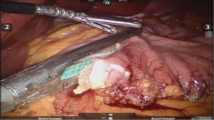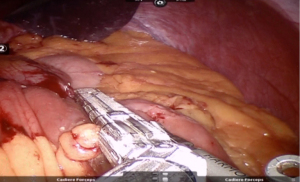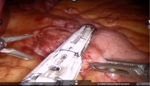 After delineating and entering lesser sac a 60-mm blue/tan cartridge is used by the surgeon on patient side to start division of stomach horizontally (Figures 7,8).
