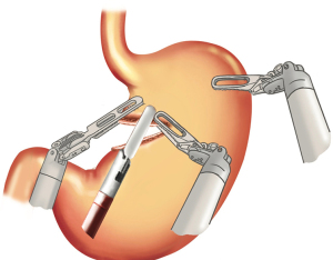 Parallel docking gives more room to the anesthetist, as well as endoscopist for intra-operative gastroscopy. The third arm of the robot comes from left side of the patient. The assistant surgeon stands by the side for complimentary maneuvers (i.e., suction, stapling, retraction etc.). With the launch of robotic staplers, the stapling can also be done from the console itself, giving the operating surgeon greater control on the surgical procedure.