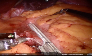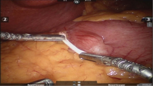Pylorus is identified and a 5 cm umbilical tape is used to measure distance of 5cms from pylorus along greater curvature where gastrolysis is begun using an energy source (Figure 19).
