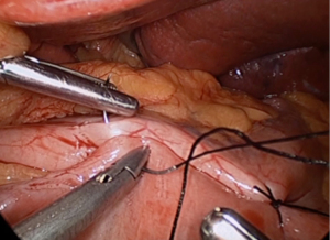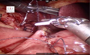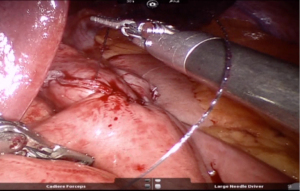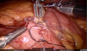 Imbrication of staple line is done keeping bougie in place using barbed 2-0 running suture as shown in figure below (Figure 23).