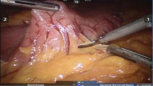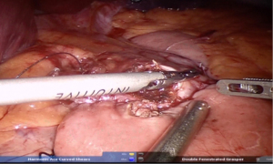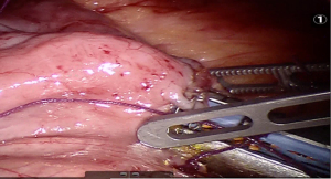 Using peri-gastric dissection, a small gastric pouch of capacity 20–30 mL is created. To start with, Phrenoesophageal membrane is divided using monopolar energy or ultrasonic shear while fundus of stomach is retracted caudally. Perigastric dissection is commenced by division of Gastrohepatic ligament between the first and second division of left gastric vessel and lesser sac is entered. It is done with the help of Harmonic scalpel in R1while stomach is being retracted laterally using R3. Care is taken to avoid injury to Vagus while entering lesser sac (Figures 5,6).