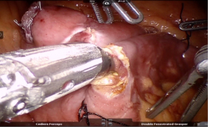 Gastrostomy & Enterotomy made using Monopolar hook/harmonic shears and stoma widened using harmonic shears in R2 creating a stoma length of 2–2.5 cm approximately (Figure 11).