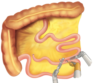 Jejuno-jejunostomy (side to side) is made using blue/tan 60 mm cartridge) (Figures 14,15).