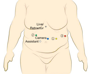 - Assistant port (12 mm diameter) is placed in between camera port and R2 with a distance of at least 10 cm from both of them.
