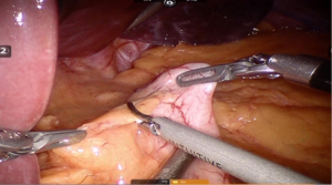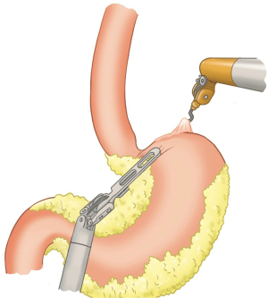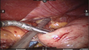 Dissection is done remaining juxtastomach to avoid injury to gastroepiploic vessels. As we proceed towards fundus of the stomach, short gastric vessels are encountered that are meticulously divided. Complete mobilization of fundus is ensured as we approach left crus and the later is meticulously defined further. While approaching and working near left crus, bougie is ensured to be present in esophagus as if beyond GE junction, it may interfere with dissection near hiatus. Hiatus hernia if identified, should be repaired to avoid gastroesophageal reflux. Distal portion of gastrocolic ligament is divided until 4–5 cm from pylorus. Any adhesions present between the stomach and anterior surface to the pancreas are taken down at this point.