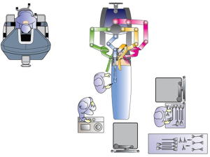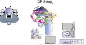 The surgeon’s console is placed in a way that operating surgeon can directly view the surgical field, and the communication between the surgeon and scrub team is easy. The video monitor and robot tower are positioned towards the head end of the patient. The anesthesia cart and instrument table are set up on one side of the patient. In the Si system, the patient cart is docked either from head end or parallel docking ensuring adequate clearance of the robot arms from the operating room table or the patient. In Xi system, the boom can move and thus the patient cart can come from one side of the patient. Target anatomy, camera port and central column all lie in the same straight line. Depending on the specific bariatric procedure, sone changes in the orientation of the robotic system may be required.