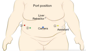 Using optical trocar, camera port is inserted slightly to left of midline, approximately 20 cm below xiphisternum. All other ports placed under vision to avoid any inadvertent injury.