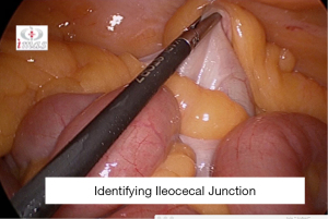 After a through diagnostic laparoscopy is performed, 1st step is to identify the ileocaecal junction (ICJ), following which small bowel is measured proximally for 250 cms and is marked at 100 and 250 cm to facilitate prepare Roux limb of 150 cm and common channel of 100 cm (Figure 26).