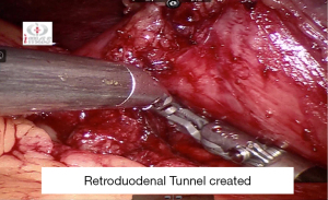 Marked bowel at 250 cm is hitched to anterior abdominal wall. Retro duodenal tunnel is meticulously dissected following which transaction is done at the level of D1 (Figure 27).