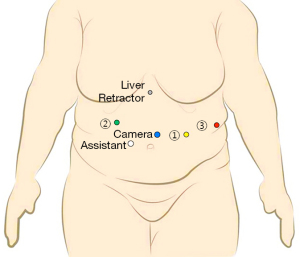 Three robotic arms with one assistant trocar and Nathanson’s liver retractor placed.
