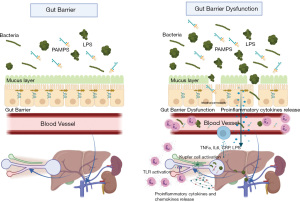 The intestinal mucosa is constantly changing, with exchange of nutrients, ions, and fluids through the epithelium, but it is also in contact with many potentially pathogenic antigens and microorganisms. It’s architecture is so elaborate that it has a contact surface of approximately 300–400 m2. It is colonized by bacteria in a range of 1×104 cells in the small bowel to 1×1014 in the colon (10). The intestinal immune system is made up of 3 different structures: Peyer’s patches, lamina propria, and the epithelium (mucosa-associated lymphoid tissue, MALT) (11). The mucosal layer produces glycoprotein, the main source of nutrition for some bacterial species, it also represents the main source of immunoglobulin A (IgA) and antimicrobial peptides, this helps to preserve intestinal integrity that protects against bacterial translocation. Another important anatomical component of the intestinal barrier is the tight junction (TJ) proteins that holds epithelial cells together while preserving the integrity of the intestinal barrier; when these proteins are under-expressed, an increase in the passage of lipopolysaccharide (LPS) and bacterial products from the bowel to the portal vein is observed (12). The second line of defense is the immune cells present in the intestinal barrier, composed mainly of lymphocytes, natural killer T cells, mononuclear phagocytes and dendritic cells. The presence of these immune cells is important to preserve intestinal homeostasis, avoiding an increase in intestinal permeability and the activation of inflammatory pathways (13) (Figure 1).